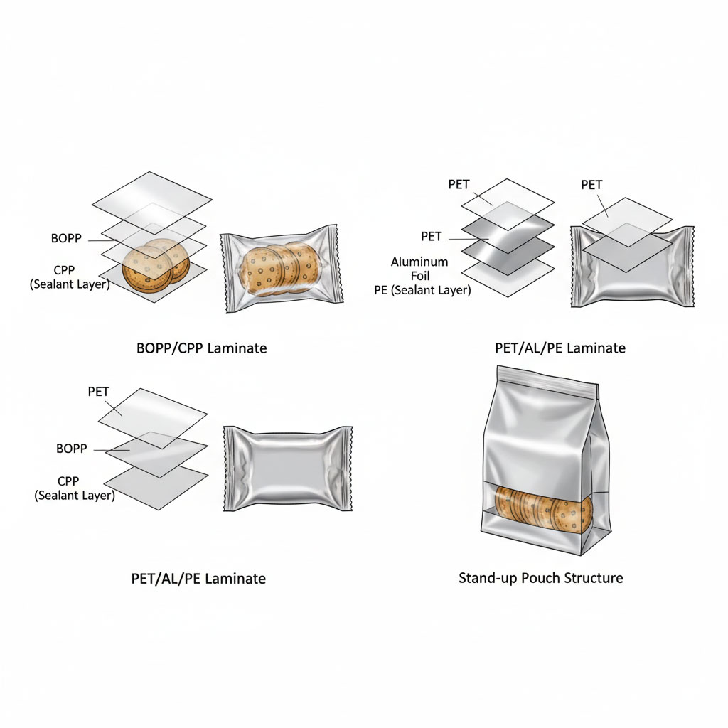 Polyethylene Terephthalate (PET) laminated with Polyethylene (PE) or with an aluminum foil layer (PET/AL/PE) provides superior barrier properties compared to BOPP/CPP. The aluminum layer in particular offers excellent oxygen and light barrier, making it the standard choice for premium biscuits, chocolate-coated products, and anything requiring extended shelf life (9 to 18 months).