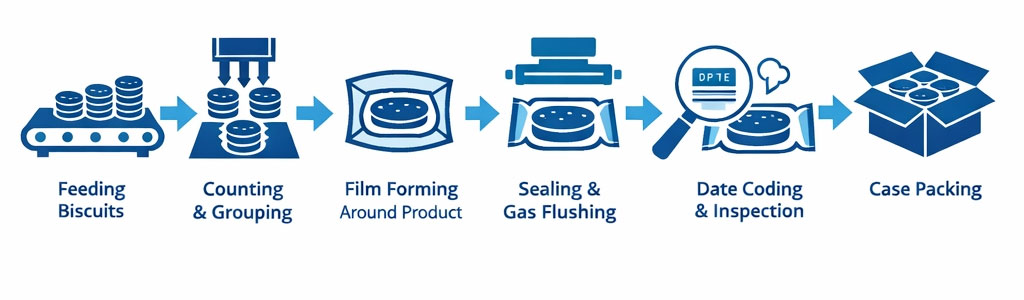 The basic functions are consistent across most models: the machine receives biscuits from an upstream production line (or manual feeding station), groups or counts them, wraps them in packaging film, seals the package, and discharges the finished product for secondary packaging or boxing. More advanced models add gas flushing for extended shelf life, date coding, metal detection, and vision inspection systems.