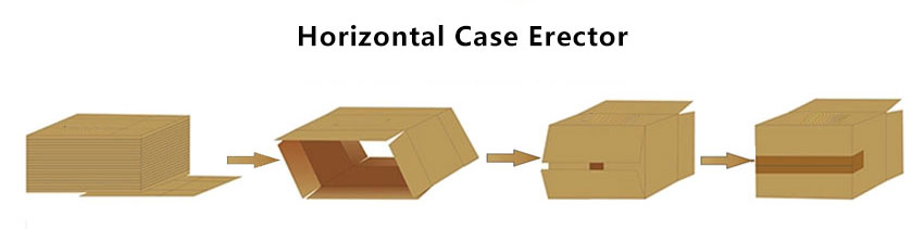 In a horizontal case erector, flat blanks are stored horizontally in a magazine. A suction system picks a blank, pulls it out sideways and opens it into a rectangular shape while the case lies on its side. The bottom flaps are folded and sealed in this horizontal position, and the erected case is then transferred onto a conveyor.