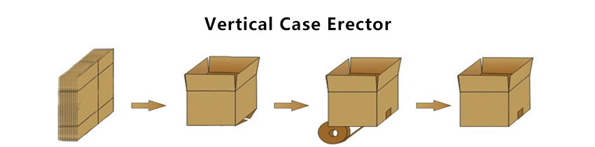 A vertical case erector keeps the case standing upright during forming. Blanks are picked from the magazine and opened so that the case stands on its bottom panel with the open top facing upward. The bottom flaps are folded and sealed while the case is in this vertical position, and the erected case is discharged standing up, ready for top-load or side-load case packing.